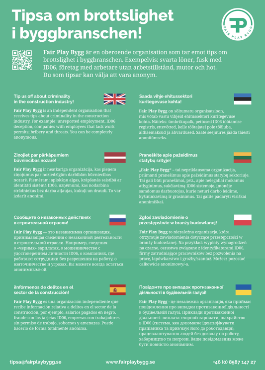 Är du arbetsgivare eller anställd på en byggarbetsplats? Ladda gärna ned och skriv ut affischen nedan och sätt upp. Då kan fler tips inkomma till Fair Play Bygg om misstänkt brottslighet i byggbranschen. På så vis hjälps vi åt att motverka misstänkt brottslighet och stärker sund konkurrens. Den som tipsar kan vara anonym.